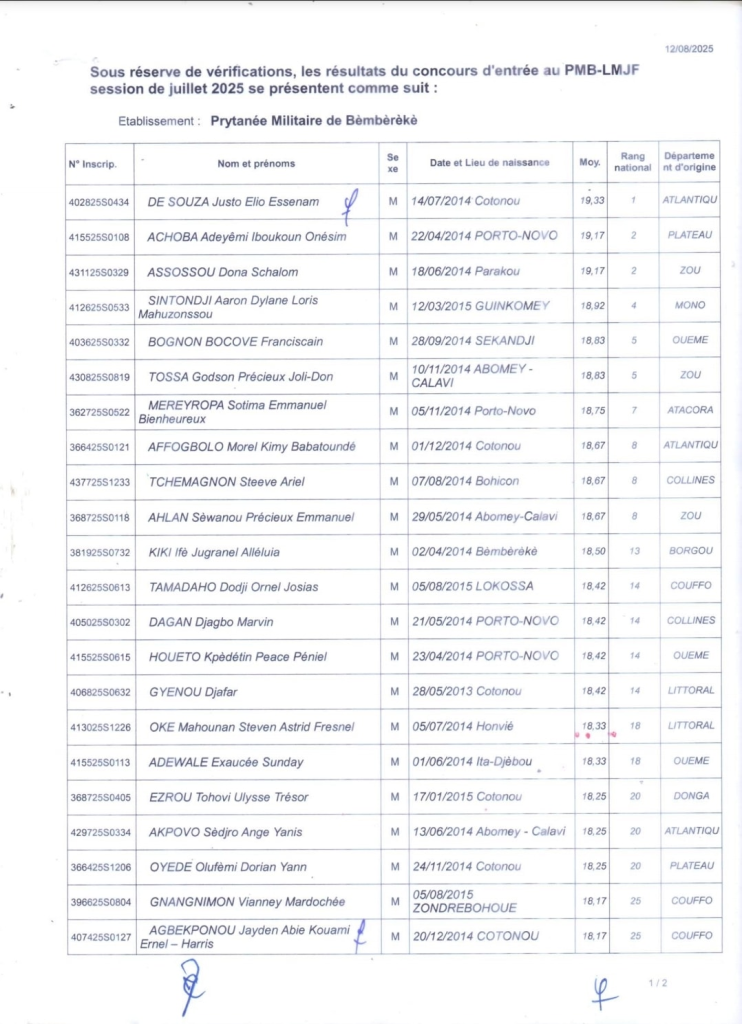 The Ministry of Elementary Education published, on August 12, 2025, the results of the entrance exam to the Bembèrèkè Military Prytanée and the Natitingou Girls Military High School. In total, 72 candidates, girls and boys, were selected subject to checks, for this July 2025 session.