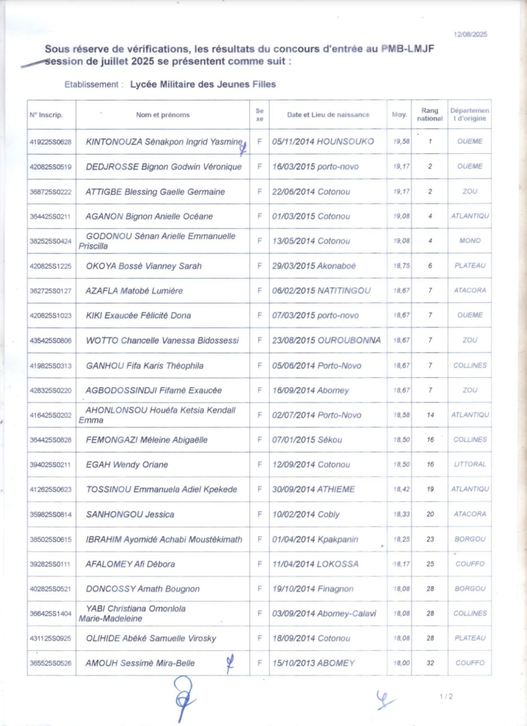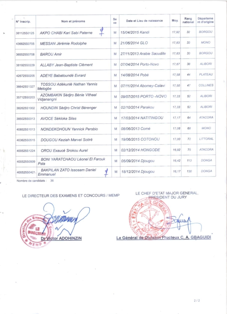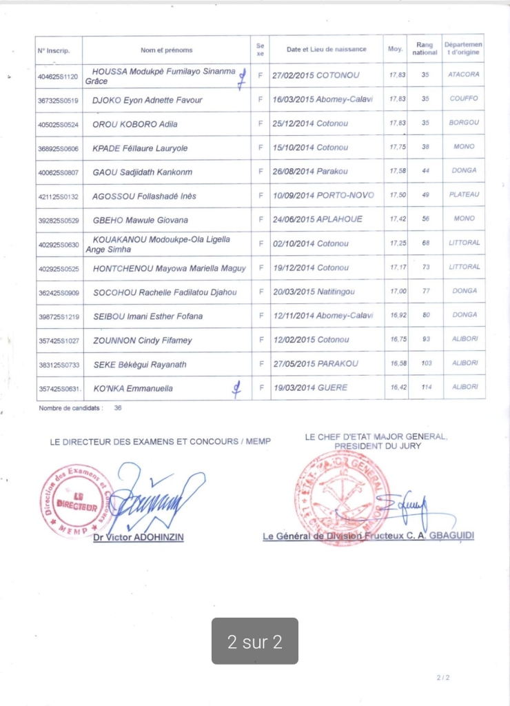 For the Girls Military High School, 36 candidates were declared admitted. Kintonuza Sénakpon Ingrid Yasmine (Ouémé), tops the ranking with an average of 19.58.