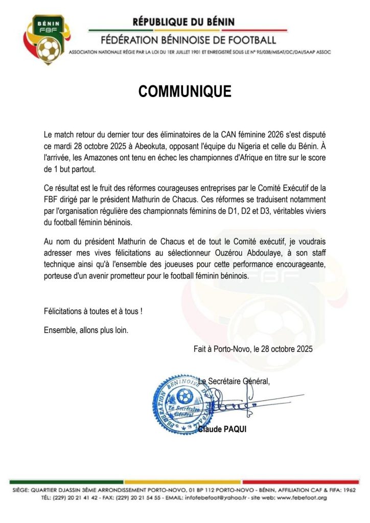 The Benin Football Federation (FBF) congratulated the women’s national team after their 1-1 draw with Nigeria on Tuesday 28 October in Abeokuta, in the return leg of the final round of qualifying for the 2026 Women’s Africa Cup of Nations.