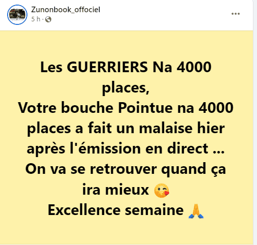 L’ancienne chroniqueuse télé a dévoilé l’information à travers une publication sur sa page Facebook dans la journée du mardi 24 mai 2022. « Les GUERRIERS Na 4000 places, Votre bouche Pointue na 4000 places a fait un malaise hier après l’émission en direct… », a écrit bébé bouche pointue.