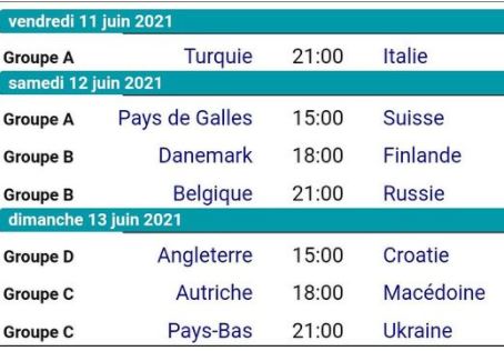 La compétition va démarrer fort avec un Turquie-Italie dans le groupe A. Dans le groupe B, la Belgique entamera sa compétition samedi face à la Russie. Plus tôt, le Danemark affrontera la Finlande. Enfin, deux affiches seront à suivre de près dimanche : Angleterre – Croatie et Pays-Bas – Ukraine. Autant dire que la compétition démarre très fort.