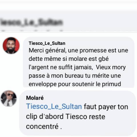 Très vite, cette publication de Molare a suscité une avalanche de réactions dont celle du chanteur Tiesco le Sultan. « Merci général, une promesse est une dette même si Molare est gbé l’argent ne suffit jamais, Vieux Mory passe à mon bureau tu mérites une enveloppe pour soutenir le primud« , a écrit l’artiste coupé-décalé.
