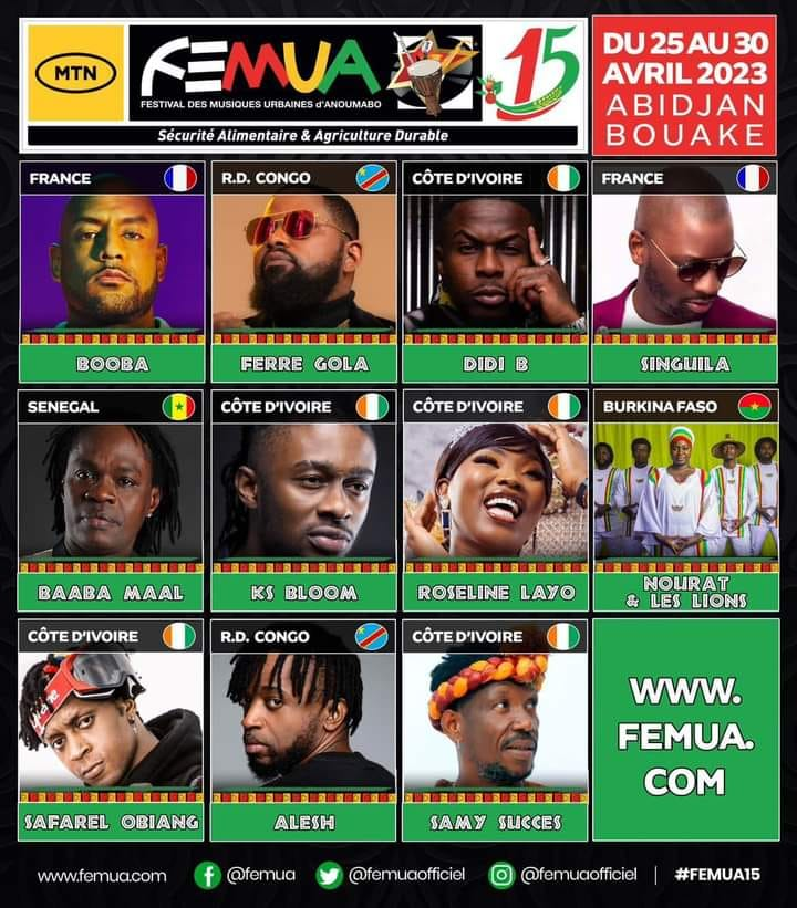 La 15ème édition du Festival des Musiques urbaines d’Anoumabo se déroulera du 25 au 30 avril 2023. Les têtes d’affiche sont connues depuis le 16 février 2023. Le rappeur français Booba fait partie des plus grosses têtes d’affiches. Il sera sur la scène du FEMUA avec l’artiste ivoirien Didi B, membre du label 92i du patron Booba.
