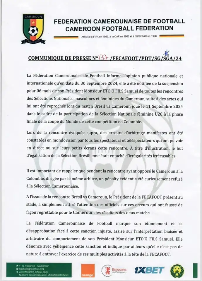 « La sanction imposée est liée au huitième de finale de la Coupe du Monde Féminine U-20 de la FIFA qui a opposé le Brésil au Cameroun à Bogotá (Colombie), le 11 septembre 2024. L’interdiction prononcée à l’encontre de M. Eto’o l’empêchera d’assister aux matches de football masculin et féminin impliquant des équipes représentatives de la FECAFOOT, dans toutes les catégories ou groupes d’âge. La décision a été notifiée à M. Eto’o aujourd’hui, date à laquelle l’interdiction est entrée en vigueur», peut-on lire sur le site de la FIFA.
