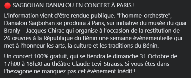 « L’information vient d’être rendue publique, « l’homme-orchestre », Danialou Sagbohan se produira à Paris, sur initiative du musée du quai Branly – Jacques Chirac qui organise à l’occasion de la restitution de 26 œuvres à la République du Bénin une semaine événementielle qui met à l’honneur les arts, la culture et les traditions du Bénin.