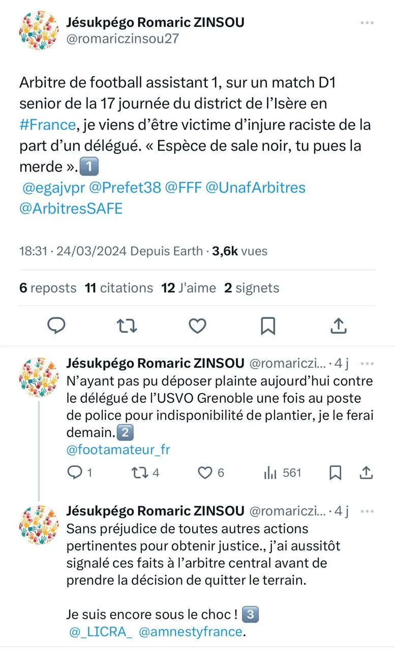 Lors d’un match auquel il participait en tant qu’arbitre assistant pour l’Olympique de Valence en France, Romaric Zinsou a été la cible d’insultes racistes de la part d’un représentant d’un club grenoblois, selon des rapports relayés par Le Dauphiné Libéré. Les attaques racistes, jugées inacceptables, ont profondément choqué l’arbitre, qui a pris la décision courageuse de quitter le terrain en plein match.