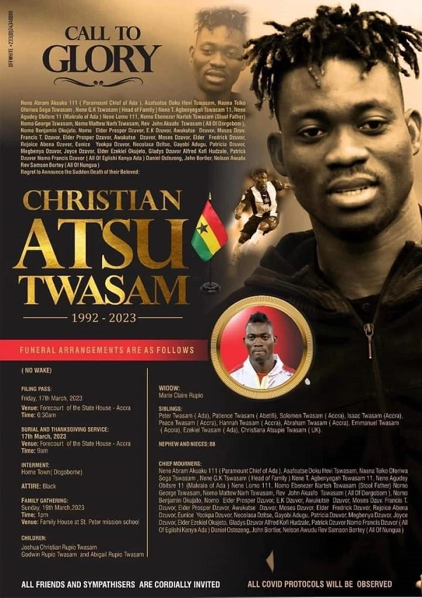 Plusieurs anciens joueurs se sont également rendus au domicile familial de leur collègue décédé pour compatir avec eux. Étaient également présents Asamoah Gyan, Sulley Muntari, Baffour Gyan, Emmanuel Agyamang-Badu et Haminu Dramani. La dépouille mortelle d’Atsu est arrivée au Ghana dans la soirée du dimanche 19 février, avec une courte cérémonie organisée au salon VIP de l’aéroport international de Kotoka pour accueillir le corps.