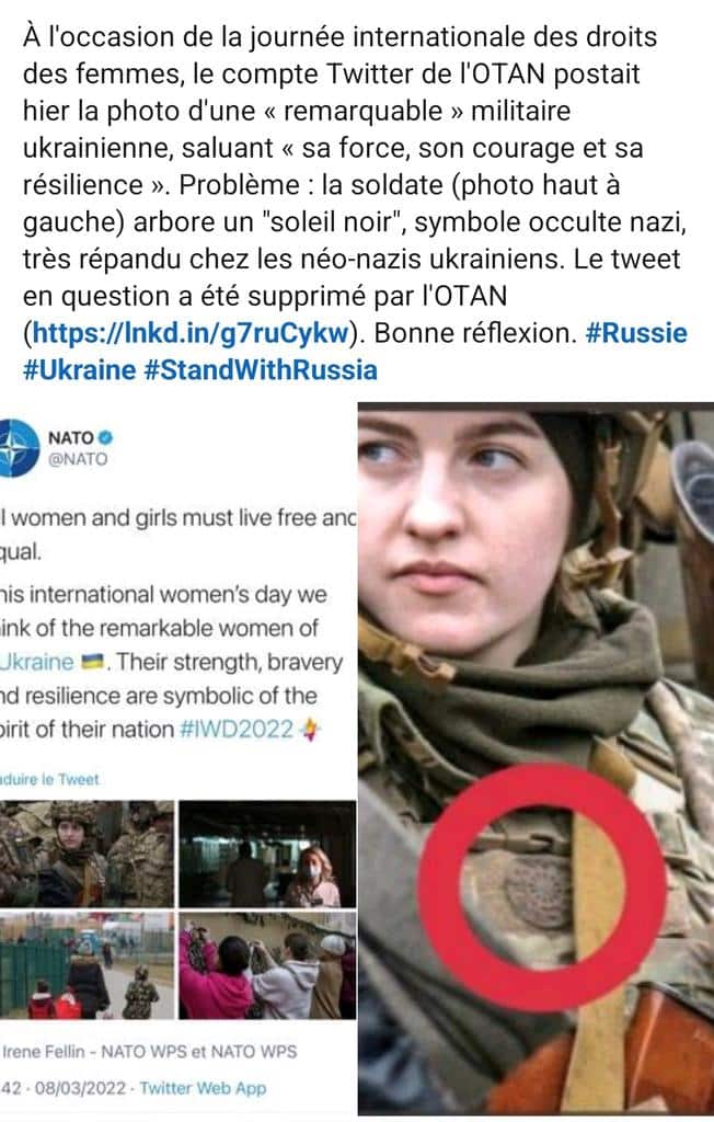 Poutine a également mis l’accent sur le fait que « les principaux pays de l’OTAN, afin d’atteindre leurs propres objectifs, soutiennent en Ukraine les ultra-nationalistes et les néonazis ». Dans un récent message de l’organisation de l’Atlantique nord sur les réseaux sociaux, à l’occasion de la journée des femmes, elle a mis en exergue une femme combattante de l’armée ukrainienne. Cependant, sur cette image on pouvait remarquer que cette combattante célébrée, portait sur son uniforme le symbole du « Soleil noir », celui des néonazis ukrainiens.