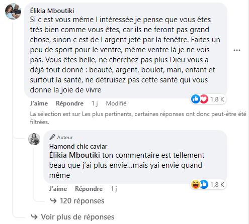 Il va plus loin en lui donnant des conseils pouvant lui permettre de garder sa ligne après 40 ans. « Faites un peu de sport pour le ventre, même ventre là, je ne vois pas. Vous êtes belle, ne cherchez pas plus. Dieu vous a déjà tout donné : beauté, argent, boulot, mari, enfant et surtout la santé, ne détruisez pas cette santé qui vous donne la joie de vivre », ajoute t-il.