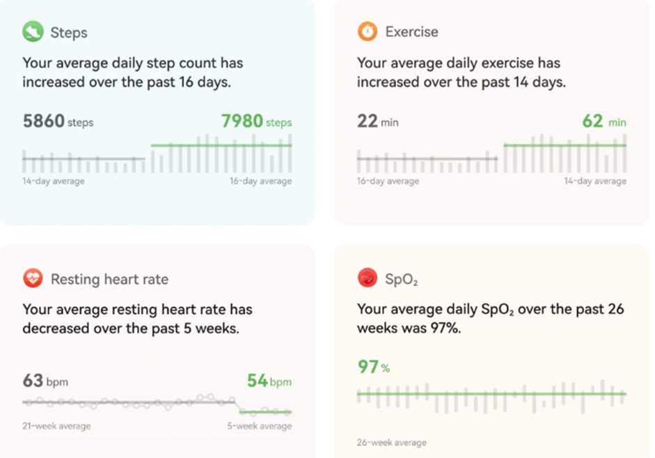 L’une des caractéristiques les plus utiles de la HUAWEI WATCH D2 est sa capacité à afficher des valeurs moyennes de votre pression artérielle haute et basse. Ces données sont analysées sur différentes périodes : au cours de la journée, de la nuit et des dernières 24 heures. Cela permet d’obtenir une vue détaillée de vos habitudes et de votre santé cardiaque. Ces moyennes vous aident à comprendre si votre tension est stable ou si des fluctuations importantes se produisent. En outre, la montre fournit des informations sur votre fréquence cardiaque, qui est un indicateur important de votre état de santé.