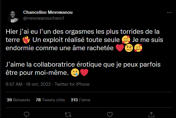 « Hier j’ai eu l’un des org@smes les plus torrides de la terre. Un exploit réalisé toute seule« , a écrit Chanceline Mèvowanou qui semble être fière de s’être faire plaisir toute seule. Elle ajoute: « Je me suis endormie comme une âme rachetée. J’aime la collaboratrice érotique que je peux parfois être pour moi-même« .