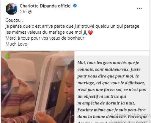 Au cœur de l’actualité depuis la fuite de la vidéo de ses fiançailles avec son chéri Fernand Lopez, Charlotte Dipanda a finalement rompu le silence. Dans un message sur sa page Facebook, la chanteuse qui n’a jamais rêvé de vivre un jour ce moment s’est lâchée.