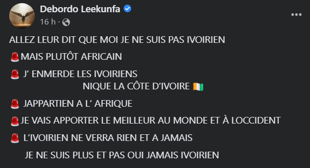 « Allez leur dire que moi, je ne suis pas Ivoirien, mais plutôt africain. J’enterre les Ivoiriens… la Côte d’Ivoire. J’appartiens à l’Afrique. Je vais apporter le meilleur au monde et à l’occident. L’Ivoirien ne verra rien. Je ne suis plus jamais ivoirien (…) Je suis africain, tout sauf la Côte d’Ivoire », a-t-il publié sur sa page Facebook.