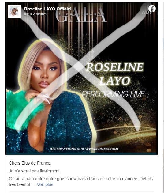Initialement prévu pour se dérouler le 5 novembre prochain en France, le concert Live de Roseline Layo n’aura finalement pas lieu. La chanteuse vient de confirmer l’information dans un post sur ses réseaux sociaux.