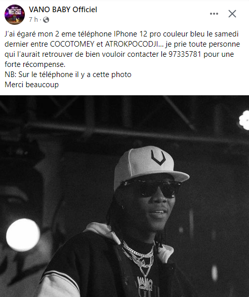 Dans une publication sur sa page Facebook, Vano a exhorté ses fans à l’aider à retrouver le portable égaré entre Cocotomey et Atrokpocodji dans la commune d’Abomey-Calavi.