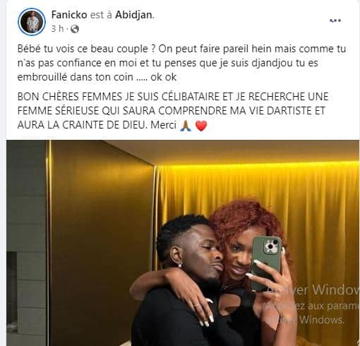 Déterminé à faire comme Didi B dans un futur proche, Fanicko a ensuite ajouté qu’il est d’ailleurs à la recherche d’une femme. « Bon chères femmes, je suis célibataire et je recherche une femme sérieuse qui saura comprendre ma vie d’artiste et aura la crainte de dieu. Merci« , a-t-il ajouté par la suite.
