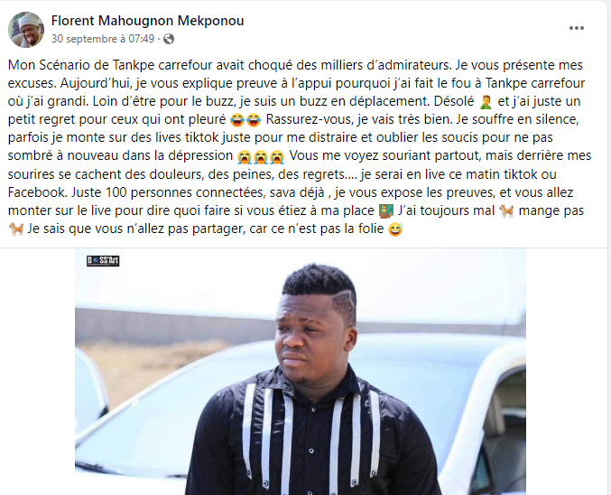 Désolé et j’ai juste un petit regret pour ceux qui ont pleuré. Rassurez-vous, je vais très bien. Je souffre en silence, parfois je monte sur des lives TikTok juste pour me distraire et oublier les soucis, pour ne pas sombrer à nouveau dans la dépression, a-t-il expliqué sur sa page Facebook au lendemain de son apparition au Carrefour Tankpè dans un état indescriptible.