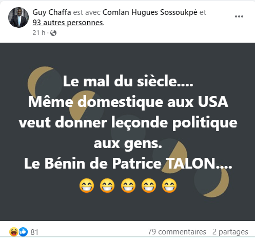 Tout est parti d’une publication de Guy Chaffa, Candidat aux législatives de 2023 sous la bannière du MPL. « Le mal du siècle…. Même domestique aux USA veut donner leçon de politique aux gens. Le Bénin de Patrice Talon », a-t-il écrit.