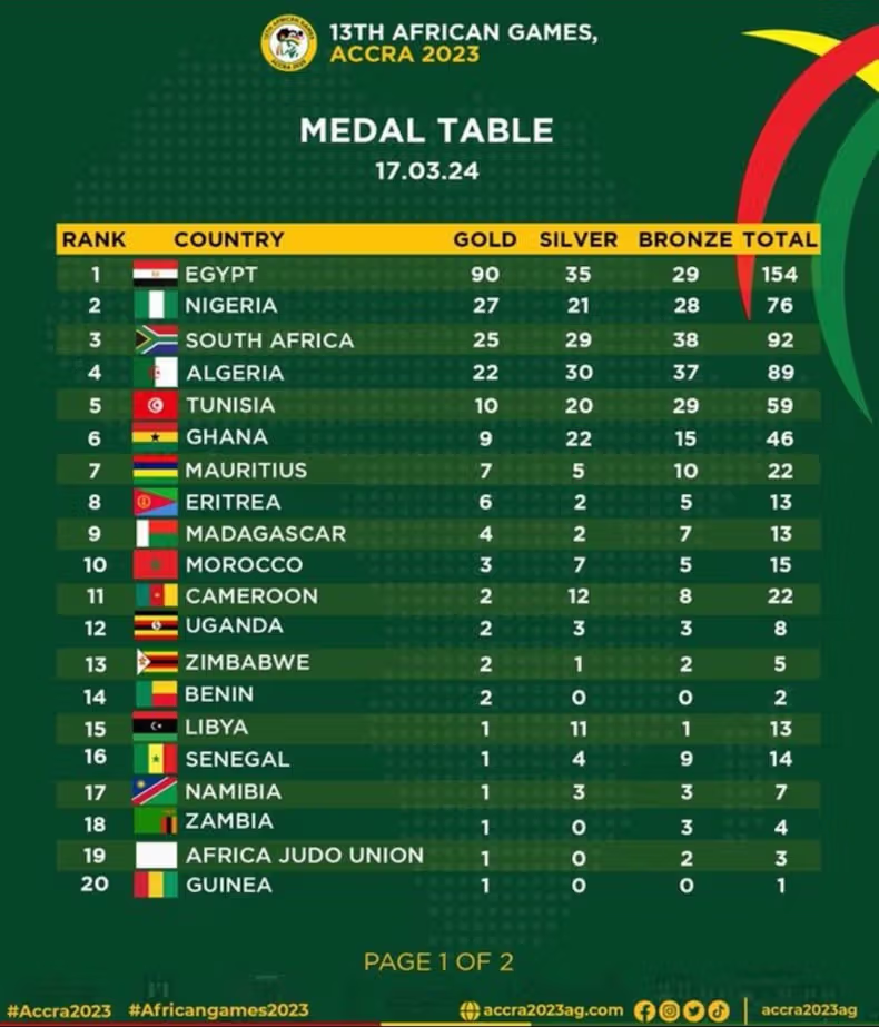 En haut du classement, le podium est dominé par l’Egypte qui totalise 154 médailles dont 90 en or, suivie de près par le Nigéria avec 76 médailles (27 en or). Très loin du duo de tête, le Bénin loge à la 14è place avec deux médailles. Deux breloques remportées par Emmanuella Marie Rose Lalèyè qui a décroché l’or en bras de fer sportif.