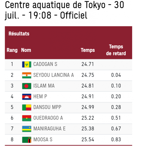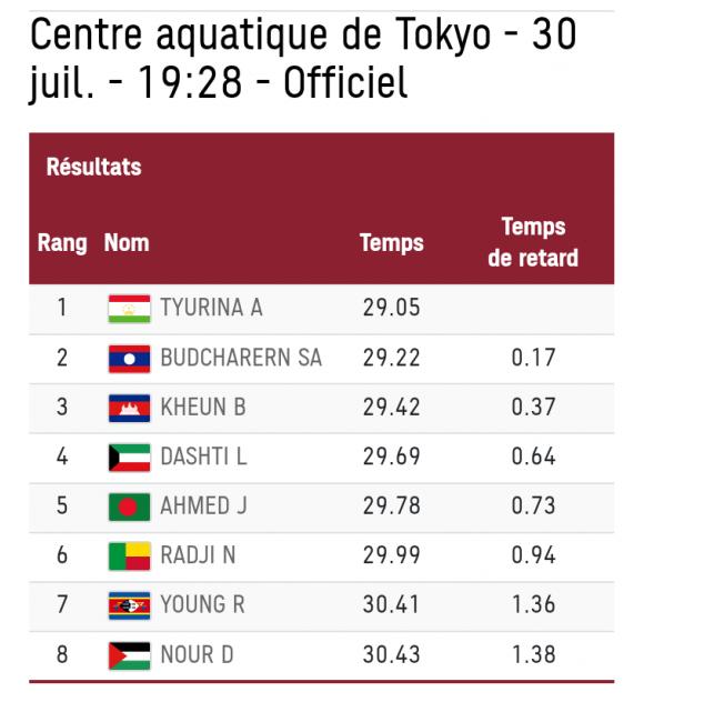 Nafissath Abéké Radji a terminé 6e chez les dames avec un chrono de 29.99, un temps bien loin des 29s 05 » de la Tadjikistanaise, Anastasiya Tyurina, qui a terminé première de sa série. C’est tout de même une petite performance pour la Béninoise de 18 ans qui a battu son record personnel qui était de 30s 04.