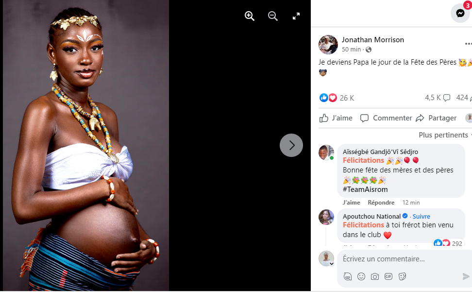 Alors que le monde entier célèbre la journée internationale dédiée aux pères, Jonathan Morrison, ex de la togolaise Maria Mobile reçoit la grâce d’être papa. Le promoteur du Cam Tchin Tchin avait annoncé fin 2022 que sa fiancée Tania Ingrid était enceinte de leur premier enfant.