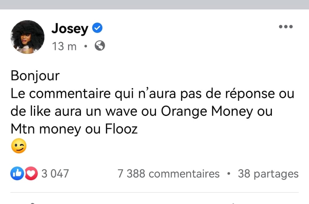 La main sur le cœur, la chanteuse Josey, compagne de l’ancien footballeur Serey DIé veut faire plaisir à ses fans. C’est dans cette optique qu’elle leur a fait une promesse qui semble tout de même irréalisable. « Le commentaire qui n’aura pas de réponse ou de like aura un wave ou Orange Money ou Mtn money ou Flooz », a écrit Josey sur sa page Facebook.