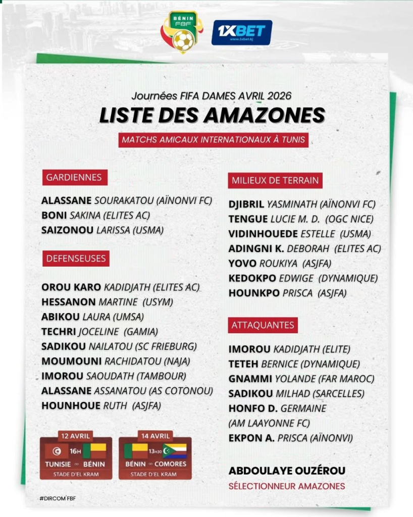 Aux côtés de ces jeunes talents, des cadres habituées de la sélection viennent apporter leur vécu international, garantissant un certain équilibre au sein du groupe. À noter toutefois les absences remarquées de Noélie Abamon, Aude Gbedjissi et Léa Fachinan, non retenues pour cette double confrontation. Le programme s’annonce relevé pour les Amazones, qui affronteront d’abord la Tunisie le 12 avril, avant de défier les Comores deux jours plus tard. Les deux rencontres se dérouleront au stade d’El Kram, à Tunis.