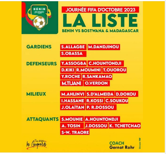 Ce samedi après-midi, le sélectionneur des guépards du Bénin, Gernot Rohr, a rendu public son groupe pour les matchs contre le Botswana et Madagascar dans le cadre des journées FIFA d’octobre 2023.