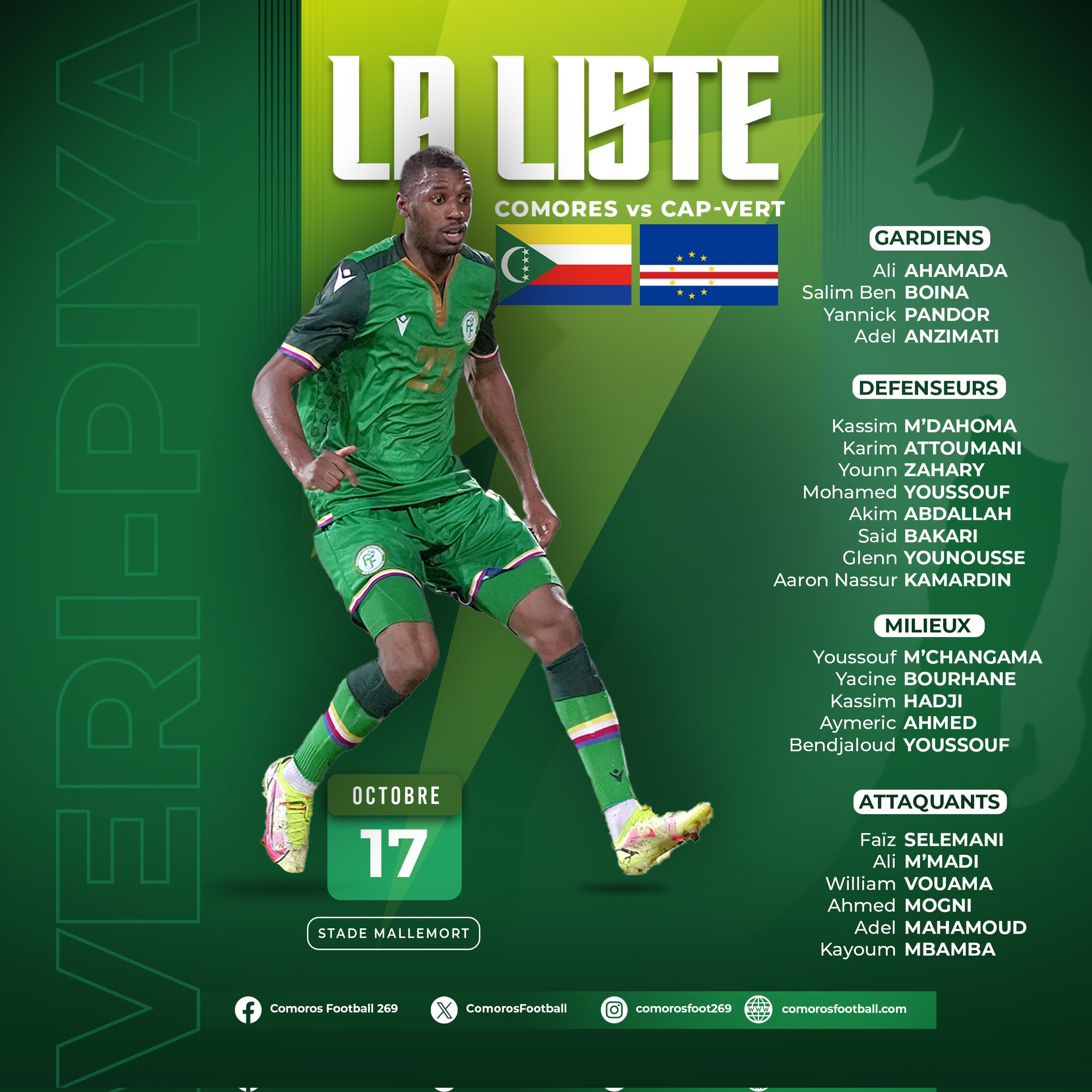 Le technicien canado-italien a convoqué un groupe de 22 joueurs, mettant en avant sa volonté de rajeunir l’équipe en faisant appel à plusieurs jeunes talents, dont Glenn Younousse (Bordeaux), Kayoum Mbamba (FC 93 Bobigny) et Kassim Hadji (Ararat , Arménie), qui vivent leur première convocation. Les deux premiers, âgés de 19 ans, ont déjà représenté les Comores au niveau des moins de 20 ans.