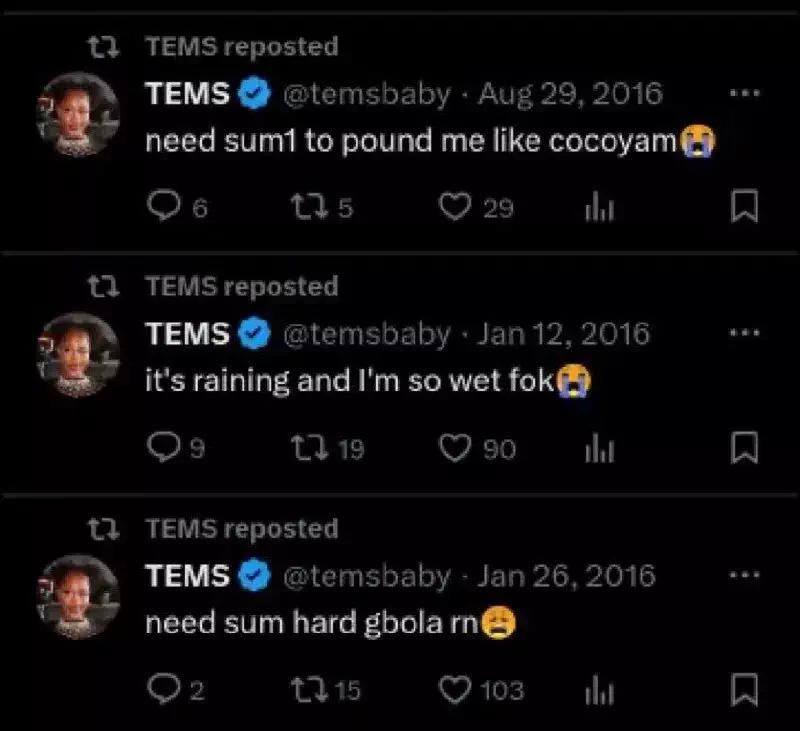 Des messages tels que « Besoin d’une bonne dose de p*nis », « Il pleut et je suis si mouillée », « J’ai besoin de quelqu’un pour me plier comme de l’igname », sont apparus dans leur plein contexte.