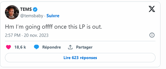 Pourtant, cette décision n’a pas calmé les internautes qui réclament des explications quant à ses publications controversées. « Avant de partir, prends le temps de t’expliquer », a écrit l’un d’entre eux en réponse à sa déclaration. Il est important de rappeler que Tems est une artiste incroyablement talentueuse, récompensée à de nombreuses reprises pour son travail acharné.