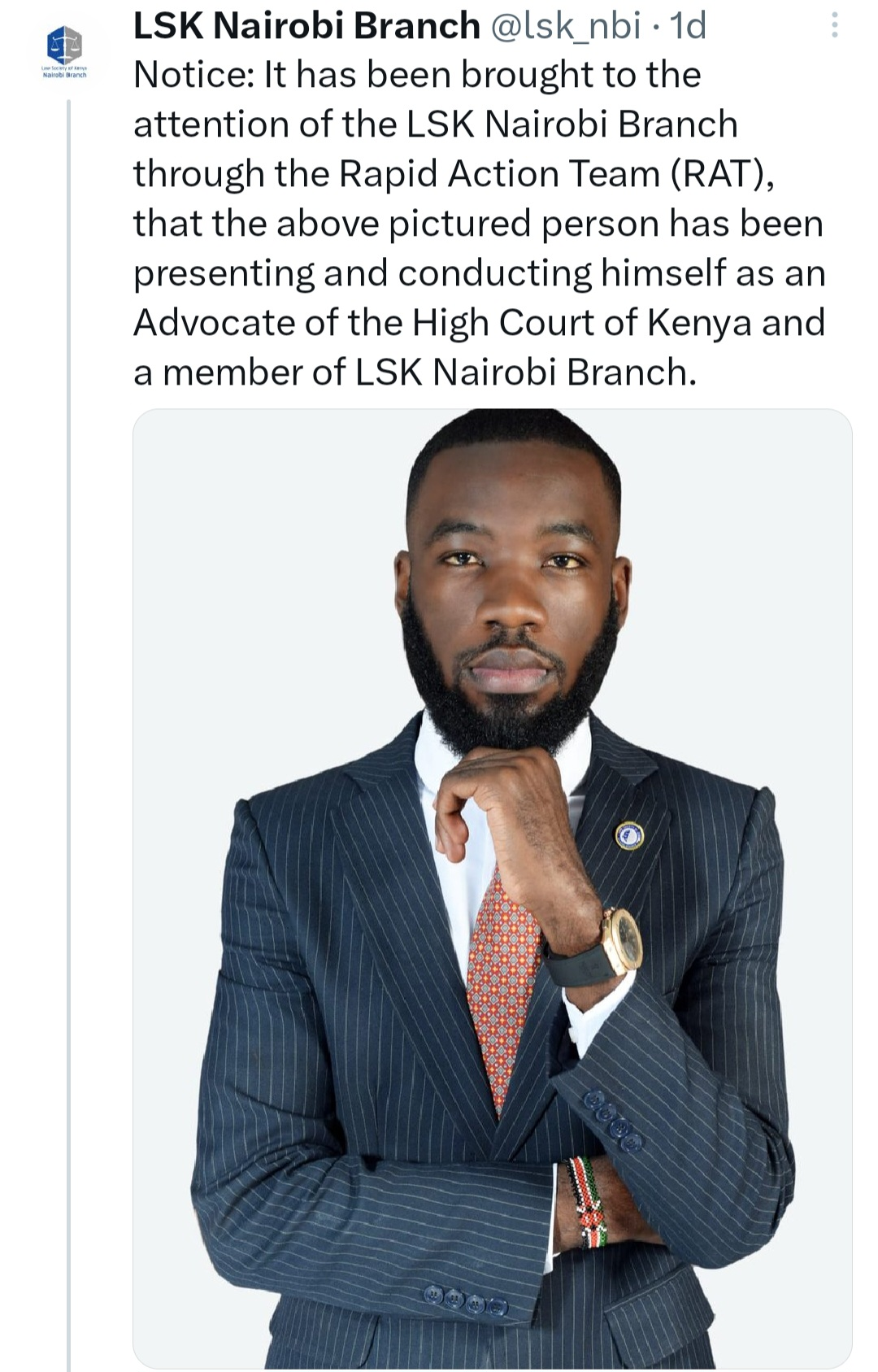 « Il a été porté à l’attention de la branche du LSK Nairobi par l’intermédiaire de l’équipe d’action rapide (RAT), que l’homme s’est présenté et s’est comporté comme un avocat auprès de la Haute Cour du Kenya« , peut-on lire dans un post sur le réseau social X de la succursale de Nairobi.