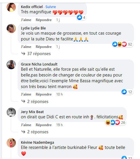 « Je vois un masque de grossesse, en tout cas courage pour la suite; Dieu te facilite, on dirait que Didi C est en route inh; félicitations; j’ai l’impression qu’elle est enceinte, ce qui joue un peu sur son apparence« , ont commenté les internautes qui espèrent une confirmation.