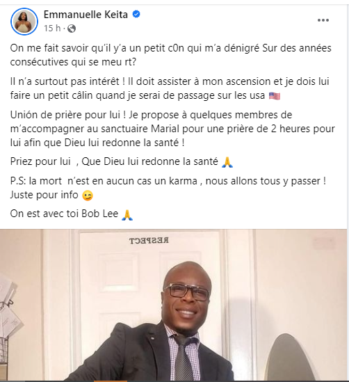 Mieux, Emmanuelle Kéita a prié pour que cette mauvaise nouvelle reste à l’étape de rumeur. C’est d’ailleurs pourquoi, EK a invité ses fans à prier pour le rétablissement de Bob Lee. « Union de prière pour lui ! Je propose à quelques membres de m’accompagner au sanctuaire Marial pour une prière de 2 heures pour lui afin que Dieu lui redonne la santé ».
