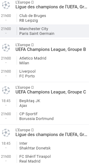 Dans les autres rencontres, Manchester City reçoit le PSG pour la première place du groupe B. Liverpool reçoit Porto pour continuer son sans faute, tandis que l’Ajax sera en déplacement sur le terrain du Besiktas.