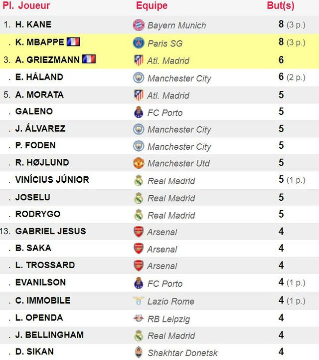 Antoine Griezmann de l’Atletico Madrid et Erling Haaland de Manchester City suivent de près avec 6 buts chacun. Cependant, la grande surprise de la semaine a été la performance de Joselu du Real Madrid, qui a inscrit un doublé crucial contre le Bayern Munich lors du match retour. Avec ces deux nouveaux buts, Joselu porte son total à 5 dans la compétition, rejoignant ainsi ses coéquipiers Vinicius Jr et Rodrygo.
