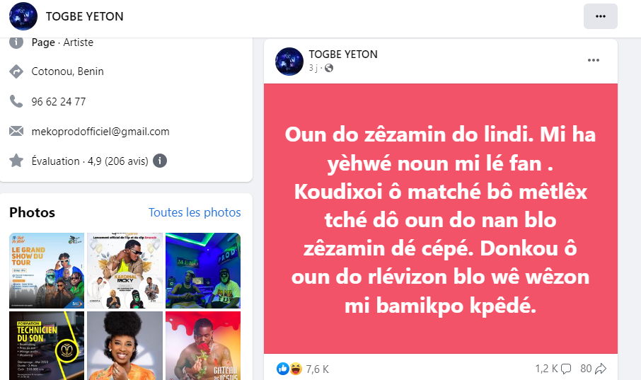 « Je compose le lundi, priez pour moi les fans. Après les cours du soir, la maitresse a proposé que je passe le CEP. Donc, je suis en pleine révision actuellement », a écrit Togbè Yéton samedi dernier en langue nationale Fongbé [« Oun do zêzamin do lindi. Mi ha yèhwé noun mi lé fan. Koudixoi ô matché bô mêtlêx tché dô oun do nan blo zêzamin dé cépé. Donkou ô oun do rlévizon blo wê wêzon mi bamikpo kpêdé »].
