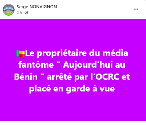 Le responsable du journal « Aujourd’hui au Bénin » a été mis aux arrêts par l’Office Central de Répression de la Cybercriminalité (OCRC) et placé en garde à vue le mercredi 24 avril 2024.