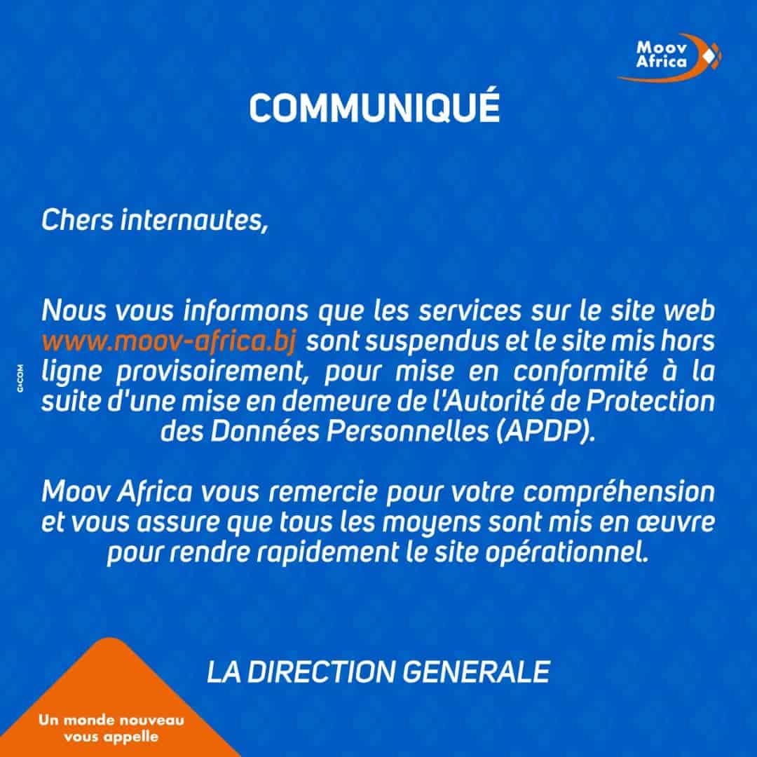Selon le message de la Direction Générale de Moov Africa, les services sur le site web www.moov-africa.bj sont suspendus et le site mis hors ligne provisoirement. Pour cause, elle évoque une volonté de mise en conformité à la « mise en demeure de l’Autorité de Protection des Données Personnelles (APDP) ».