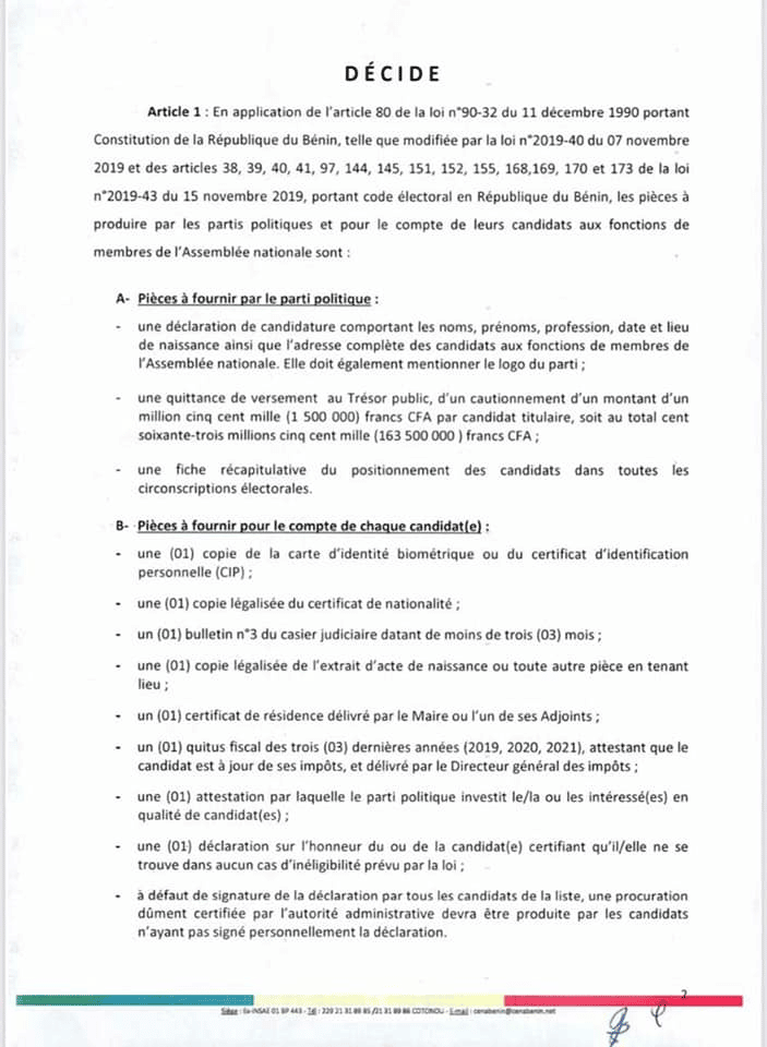 Dans sa décision, la commission électorale nationale autonome (CENA) a spécifié les dossiers à fournir aussi bien par les partis politiques en lice pour ces élections mais aussi les dossiers par candidat.