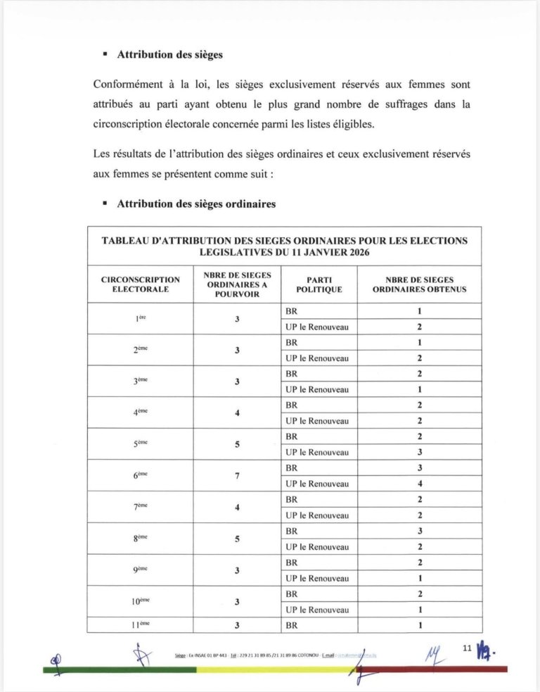 D’après les données provisoires de la CENA, l’Union Progressiste le Renouveau arrive en tête et obtient 60 sièges à l’Assemblée nationale. Le Bloc Républicain suit avec 49 sièges, portant à 109 le nombre total de députés élus.