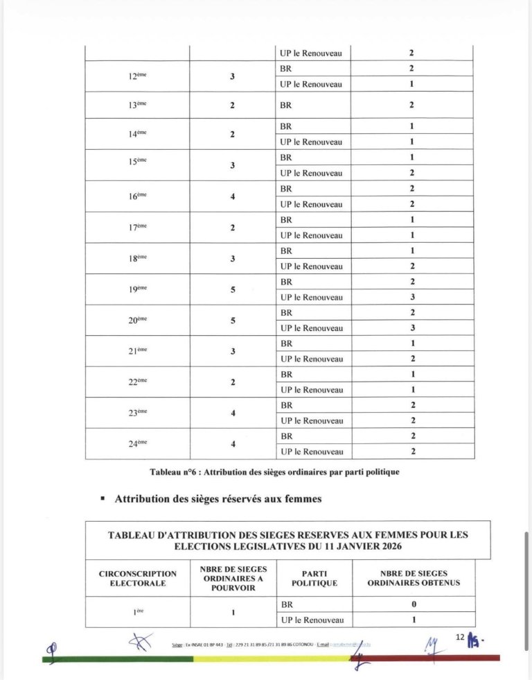 Il s’agit du Bloc Républicain (BR) et de l’Union Progressiste le Renouveau (UP-R), les deux formations ayant franchi le seuil légal requis dans l’ensemble des circonscriptions électorales, conformément aux dispositions du Code électoral.