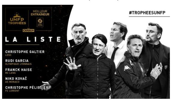 Christophe Galtier fait figure de favori ultime, avec la saison exceptionnelle de Lille. Kovac est récompensé de sa première saison très réussie avec l’ASM. Très critiqué et probable partant en fin de saison, Garcia est pourtant présent. Haise et Pélissier sont distingués pour leur bon travail à la tête de clubs promus.