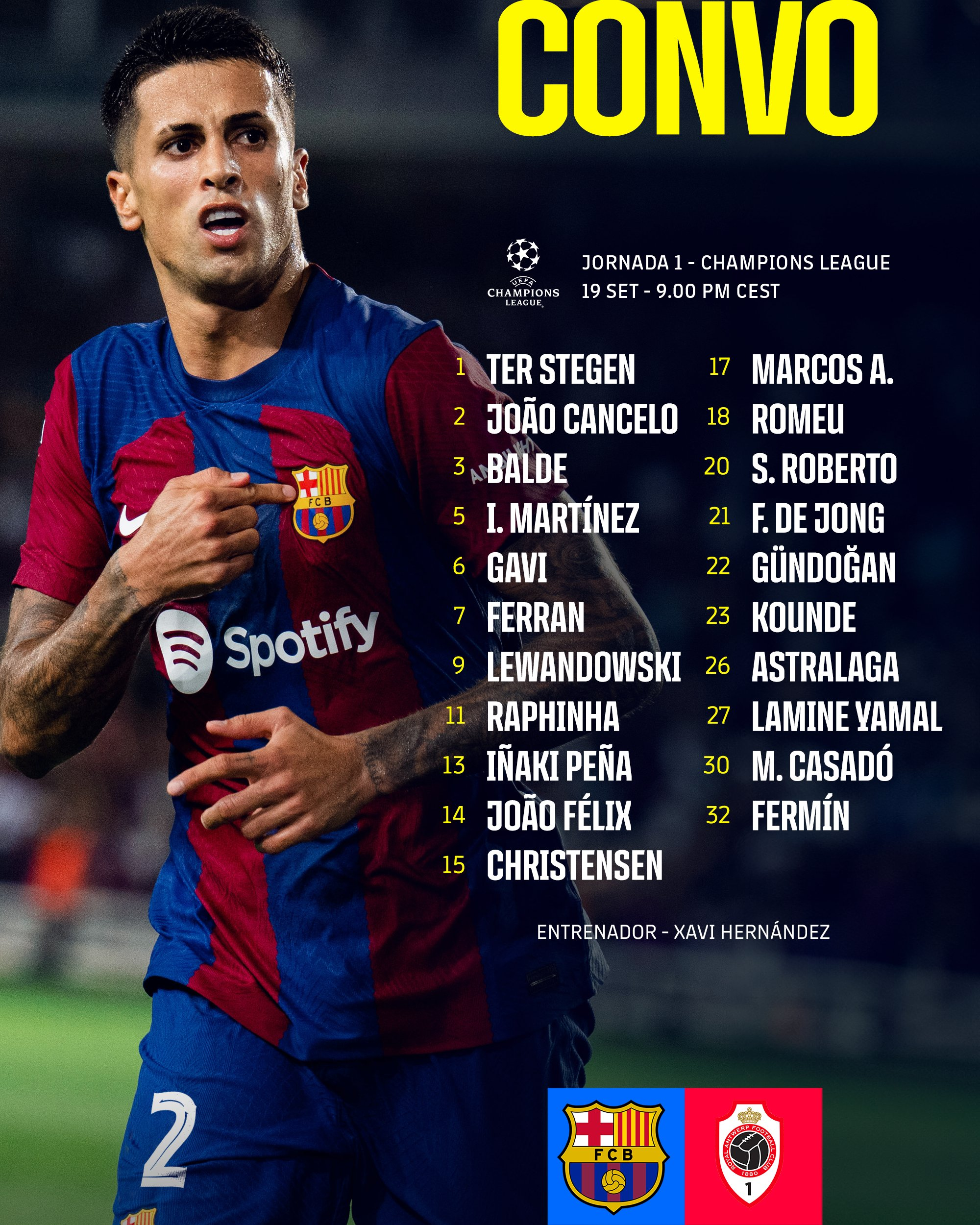 Pour ce match à domicile, l’entraineur Xavi Hernandez a fait appel à un groupe de 21 joueurs. Dans le lot, on retrouve les nouvelles recrues Joao Félix et Joao Cancelo, qui ont déjà fait parler la poudre en marquant des buts lors de la victoire écrasante contre le Real Betis ce samedi (5-0) en 5e journée de Liga.