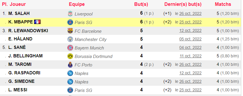 Les deux co-leaders devancent Robert Lewandowski (FC Barcelone) et Erling HÃ¥land (Manchester City), auteurs de 5 buts. Derrière, on retrouve Lionel Messi (PSG), Leroy Sané (Bayern), Jude Bellingham (Dortmund), Mehdi Taremi (Porto), Giacomo Raspadori (Naples) et Giovanni Simeone (Naples) avec 4 réalisations.
