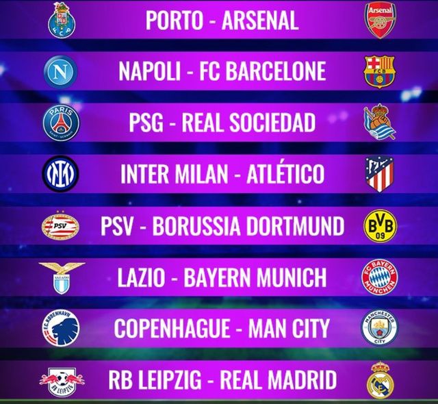 Le FC Arsenal, leader de Premier League, défiera Porto, puis le PSV, auteur d’un incroyable 16/16 en championnat, affrontera le Borussia Dortmund. Enfin, le Bayern Munich s’est vu attribuer la Lazio Rome. Les matchs aller se dérouleront les 13 et 14, puis les 20 et 21 février. Les matchs retour sont eux programmés les 5 et 6 puis 12 et 13 mars.