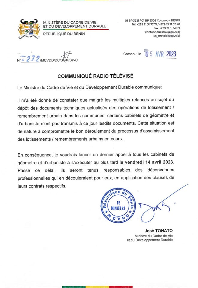 Communiqué du Ministre du Cadre de vie et du Développement Durable relatif à la relance au sujet du dépôt des documents techniques actualisés, par les cabinets de géomètre et d’urbaniste dans le cadre des opérations de lotissement / remembrement urbain des communes.
