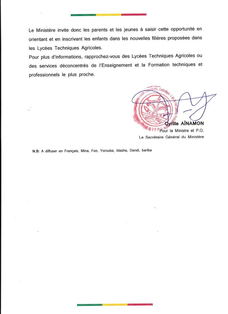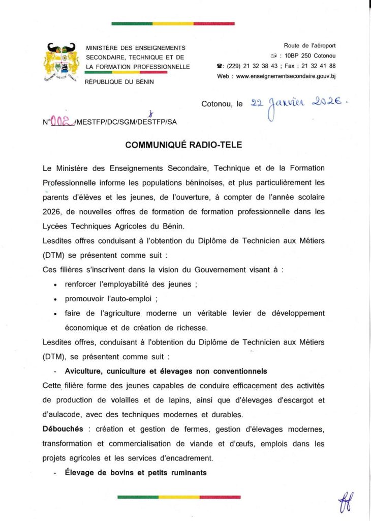 Le Ministère des Enseignements Secondaire, Technique et de la Formation Professionnelle a annoncé l’ouverture de nouvelles filières de formation professionnelle dans les Lycées Techniques Agricoles à partir de l’année scolaire 2026. Ces formations visent à offrir plus d’opportunités d’insertion et d’auto-emploi aux jeunes béninois.