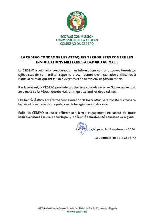 Mali : la CEDEAO condamne les attaques terroristes contre les installations militaires à Bamako