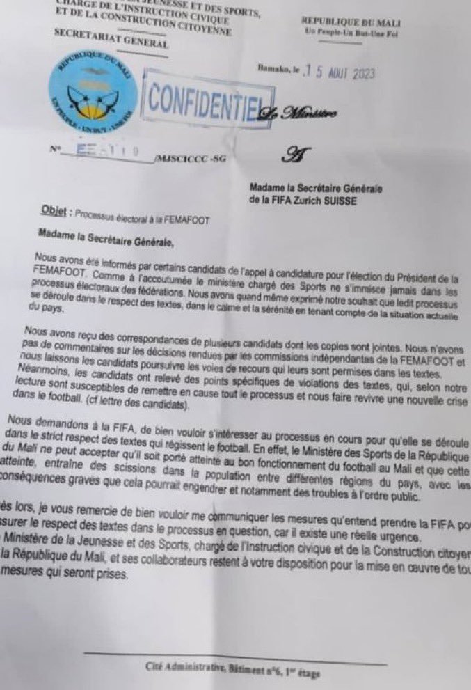 Le ministère de la Jeunesse et des Sports du Mali a adressé un courrier à la FIFA concernant le processus électoral de la Fédération malienne de football (Femafoot). L’Etat demande à l’instance mondiale de se pencher sur le processus électoral de la Femafoot. Le ministère a remarqué après certaines plaintes que plusieurs textes ont été violés par les commissions actuelles.